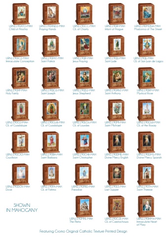 URN1190HF-MAHHoly FamilyURN1190GU-MAHOL of GuadalupeURN1190CX2-MAHCrucifixionURN1190DOV-MAHDoveURN1190IC2-MAHImmaculate ConceptionURN1190ATO-MAHChild of AtochaURN1190FA-MAHOL of FatimaURN1190BA-MAHSaint BarbaraURN1190HND2-MAHPraying HandsURN1190PAT-MAHSaint PatrickURN1190JO3-MAHSaint JosephURN1190GU8-MAHOL of GuadalupeURN1190MHL-MAHThe PietaURN1190JP-MAHJesus PrayingURN1190PRD-MAHParadiseURN1190JS2-MAHJesus ShepherdURN1190CC-MAHOL of CharityURN1190CHR-MAHSaint ChristopherURN1190LOU-MAHOL of LourdesURN1190JU-MAHSaint JudeURN1190LS-MAHLast SupperURN1190MI-MAHSaint MichaelURN1190IP-MAHInfant of PragueURN1190ANT-MAHSaint AnthonyURN1190DME-MAHDivine Mercy EnglishURN1190CZE-MAHOL of CzestochowaURN1190TH-MAHSaint ThereseURN1190RM-MAHMystical RoseURN1190OLR-MAHOL of the RosaryURN1190IHM4-MAHImmaculate Heartof MaryURN1190DMS-MAHDivine Mercy SpanishURN1190MDN4-MAHMadonna of The StreetURN1190JL-MAHOL of San Juan de LagosFeaturing Cromo Original Catholic Texture Printed DesignSHOWNIN MAHOGANY