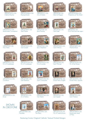 URN1870HF-CRSHoly FamilyURN1870GU-CRSOL of GuadalupeURN1870CX2-CRSCrucifixionURN1870DOV-CRSDoveURN1870ATO-CRSChild of AtochaURN1870IC2-CRSImmaculate ConceptionURN1870PRD-CRSParadiseURN1870FA-CRSOL of FatimaURN1870BA-CRSSaint BarbaraURN1870PAT-CRSSaint PatrickURN1870JO3-CRSSaint JosephURN1870GU8-CRSOL of GuadalupeURN1870HND2-CRSPraying HandsURN1870MHL-CRSThe PietaURN1870JP-CRSJesus PrayingURN1870JS2-CRSJesus ShepherdURN1870CC-CRSOL of CharityURN1870CHR-CRSSaint ChristopherURN1870LOU-CRSOL of LourdesURN1870TWH-CRSTwin HeartsURN1870IP-CRSInfant of PragueURN1870JU-CRSSaint JudeURN1870LS-CRSLast SupperURN1870MI-CRSSaint MichaelURN1870ANT-CRSSaint AnthonyURN1870CZE-CRSOL of CzestochowaURN1870DME-CRSDivine Mercy EnglishURN1870TH-CRSSaint ThereseURN1870RM-CRSMystical RoseURN1870OLR-CRSOL of the RosaryURN1870IHM4-CRSImmaculate Heartof MaryURN1870DMS-CRSDivine Mercy SpanishURN1870MDN4-CRSMadonna of The StreetURN1870JL-CRSOL of San Juan de LagosFeaturing Cromo Original Catholic Texture Printed DesignsSHOWNIN CRESTONE