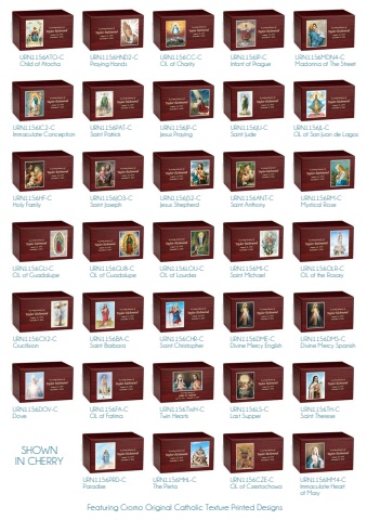 URN1156HF-CHoly FamilyURN1156CX2-CCrucifixionURN1156DOV-CDoveURN1156GU-COL of GuadalupeURN1156ATO-CChild of AtochaURN1156IC2-CImmaculate ConceptionURN1156PRD-CParadiseURN1156FA-COL of FatimaURN1156BA-CSaint BarbaraURN1156PAT-CSaint PatrickURN1156JO3-CSaint JosephURN1156GU8-COL of GuadalupeURN1156HND2-CPraying HandsURN1156MHL-CThe PietaURN1156JP-CJesus PrayingURN1156CC-COL of CharityURN1156LOU-COL of LourdesURN1156TWH-CTwin HeartsURN1156JS2-CJesus ShepherdURN1156CHR-CSaint ChristopherURN1156JU-CSaint JudeURN1156LS-CLast SupperURN1156MI-CSaint MichaelURN1156IP-CInfant of PragueURN1156ANT-CSaint AnthonyURN1156CZE-COL of CzestochowaURN1156DME-CDivine Mercy EnglishURN1156TH-CSaint ThereseURN1156RM-CMystical RoseURN1156OLR-COL of the RosaryURN1156IHM4-CImmaculate Heartof MaryURN1156DMS-CDivine Mercy SpanishURN1156MDN4-CMadonna of The StreetURN1156JL-COL of San Juan de LagosFeaturing Cromo Original Catholic Texture Printed DesignsSHOWNIN CHERRY