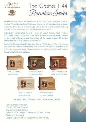 URN1144SHJ6-Oshown in OAKURN1144SHJ6-Mshown in MAPLEURN1144SHJ6-Wshown in WALNUTURN1144SHJ6-Cshown in CHERRYFeaturing Cromo Original Catholic Texture Printed DesignsFeatures: Made in the USASize: 10 x 7.75 x 6.75 inchesCapacity: 215 Cubic InchesMaterial: Oak, Walnut, Mahogany, Cherry, MapleOrientation: HorizontalDesigns: Original Catholic Designs from Cromo NB ItalyURN1144SHJ6-MAHshown in MAHOGANYExperience the artistry of remembrance with our Cromo Original CatholicTexture Printed Design Urns. Utilizing an innovative UV-cured printing process,each urn showcases a lifelike image with a raised, tactile surface, allowingfamilies to touch and feel the cherished memories it holds.Individually handcrafted from 5 Types of wood finishes: Oak, Walnut,Mahogany, Cherry and Hard Maple, these urns emphasize the natural beautyof the wood while enhancing the texture of the raised image. This uniquedesign creates a truly one-of-a-kind memorial.Featuring Original Italian Designs from Cromo NB Studios in Milan, Italy, theseurns combine timeless craftsmanship with profound devotion. It includes up to3 lines for personalization, allowing families to add a heartfelt touch to theirloved one%u2019s final resting place.