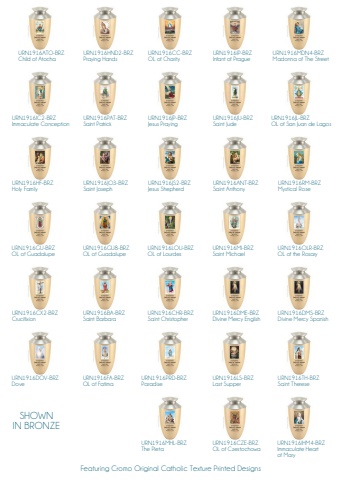 URN1916HF-BRZHoly FamilyURN1916GU-BRZOL of GuadalupeURN1916CX2-BRZCrucifixionURN1916DOV-BRZDoveURN1916ATO-BRZChild of AtochaURN1916IC2-BRZImmaculate ConceptionURN1916FA-BRZOL of FatimaURN1916BA-BRZSaint BarbaraURN1916JO3-BRZSaint JosephURN1916PAT-BRZSaint PatrickURN1916GU8-BRZOL of GuadalupeURN1916HND2-BRZPraying HandsURN1916PRD-BRZParadiseURN1916MHL-BRZThe PietaURN1916JP-BRZJesus PrayingURN1916JS2-BRZJesus ShepherdURN1916CC-BRZOL of CharityURN1916LOU-BRZOL of LourdesURN1916CHR-BRZSaint ChristopherURN1916IP-BRZInfant of PragueURN1916JU-BRZSaint JudeURN1916MI-BRZSaint MichaelURN1916LS-BRZLast SupperURN1916ANT-BRZSaint AnthonyURN1916CZE-BRZOL of CzestochowaURN1916DME-BRZDivine Mercy EnglishURN1916TH-BRZSaint ThereseURN1916RM-BRZMystical RoseURN1916IHM4-BRZImmaculate Heartof MaryURN1916OLR-BRZOL of the RosaryURN1916DMS-BRZDivine Mercy SpanishURN1916MDN4-BRZMadonna of The StreetURN1916JL-BRZOL of San Juan de LagosFeaturing Cromo Original Catholic Texture Printed DesignsSHOWNIN BRONZE