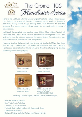 URN1106SHJ6-Cshown in CHERRYURN1106SHJ6-Oshown in OAKURN1106SHJ6-Wshown in WALNUTURN1106SHJ6-RWshown in WALNUTwith ROSEWOOD finishFeaturing Cromo Original Catholic Texture Printed DesignsFeatures: Made in the USASize: 9 x 6.75 x 6.75 inchesCapacity: 215 Cubic InchesMaterial: Oak, Walnut, Walnut with Rosewood, CherryOrientation: HorizontalDesigns: Original Catholic Designs from Cromo NB ItalyHonor a life well-lived with the Cromo Original Catholic Texture Printed DesignUrns. Utilizing an advanced UV-cured printing technique, each urn features abeautifully raised, tactile image, adding depth and dimension to cherishedmemories. This unique process allows families to see and feel the artistry ofremembrance.Individually handcrafted from premium wood finishes%u2014Oak, Walnut, Walnut withRosewood, and Cherry%u2014these urns showcase the natural elegance of fine woodwhile enhancing the intricate texture of the printed design. Each piece is a oneof-a-kind memorial, crafted with care and precision.Featuring Original Italian Artwork from Cromo NB Studios in Milan, Italy, theseurns embody a perfect blend of timeless craftsmanship and deep devotion.Families can personalize their tribute with up to three lines of engraving, creatinga meaningful and lasting legacy.