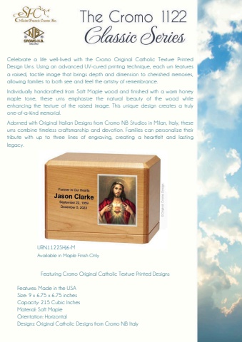 URN1122SHJ6-MAvailable in Maple Finish OnlyFeaturing Cromo Original Catholic Texture Printed DesignsFeatures: Made in the USASize: 9 x 6.75 x 6.75 inchesCapacity: 215 Cubic InchesMaterial: Soft MapleOrientation: HorizontalDesigns: Original Catholic Designs from Cromo NB ItalyCelebrate a life well-lived with the Cromo Original Catholic Texture PrintedDesign Urns. Using an advanced UV-cured printing technique, each urn featuresa raised, tactile image that brings depth and dimension to cherished memories,allowing families to both see and feel the artistry of remembrance.Individually handcrafted from Soft Maple wood and finished with a warm honeymaple tone, these urns emphasize the natural beauty of the wood whileenhancing the texture of the raised image. This unique design creates a trulyone-of-a-kind memorial.Adorned with Original Italian Designs from Cromo NB Studios in Milan, Italy, theseurns combine timeless craftsmanship and devotion. Families can personalize theirtribute with up to three lines of engraving, creating a heartfelt and lastinglegacy.